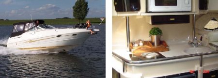 | Ca. 8,48m x 2,67m, Tiefgang: 0,45m, Baujahr: 1998, 270PS Mercruiser 7.3L-D-tron Diesel (6 Zyl.), 4/6 Schlafplätze, Bugstrahlruder, Material: GFK, Code: H |